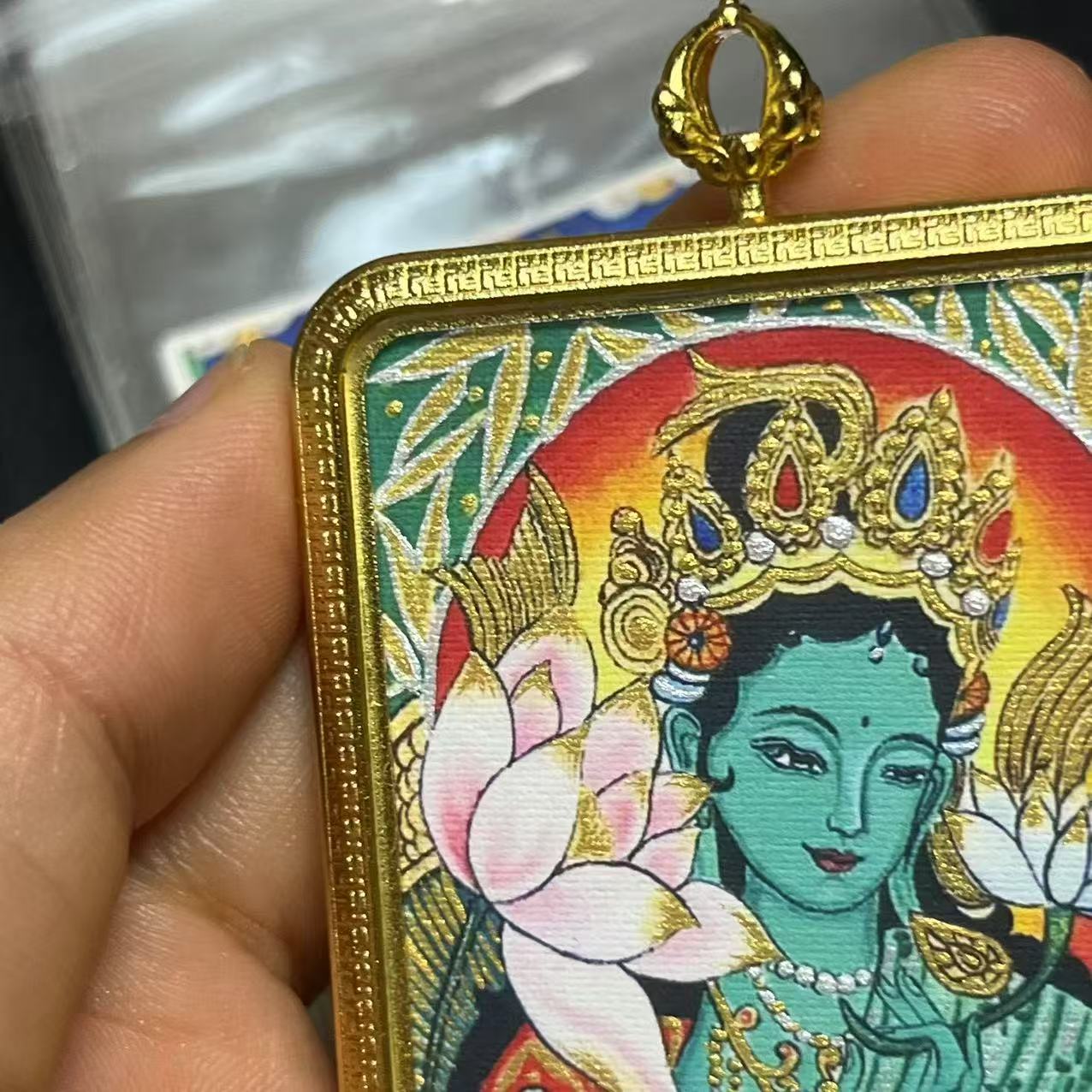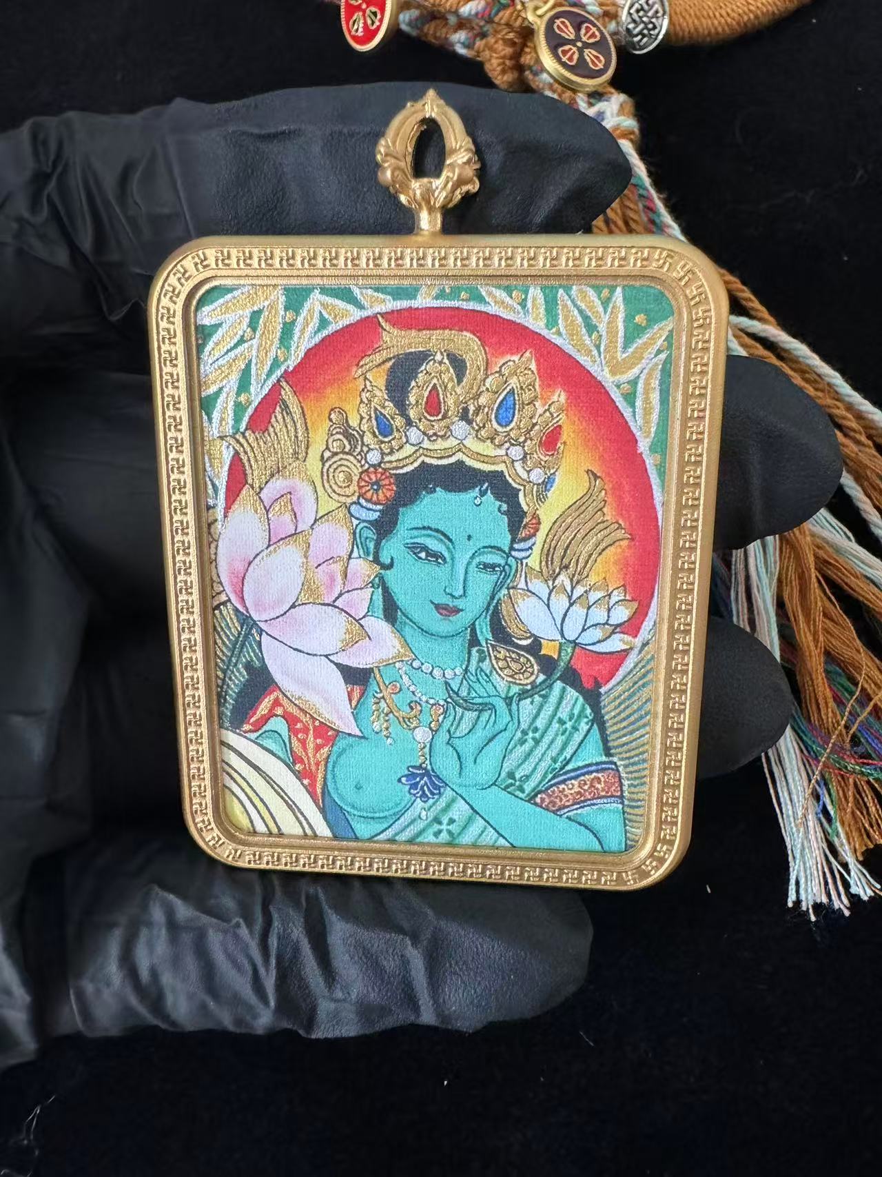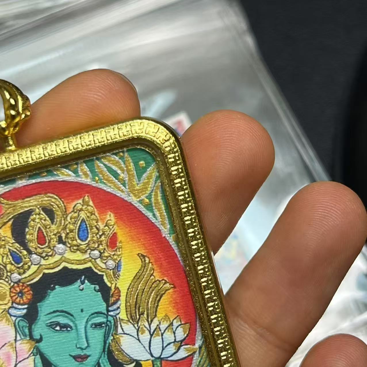 This 4×5 cm Tangka necklace is an ingenious hand-painted image of a very representative god in Tibetan Buddhism. The big black sky suppresses evil and evil, the black god of wealth and the yellow god of wealth attract wealth and blessings, the pharmacist Buddha protects the body and mind, the Nanhai Guanyin is compassionate and relieves suffering, and the green mother and the white mother bless peace and prosperity. With traditional Tangka technology, natural pigments are used to outline the solemn appearance of the law, and the profound Buddhist culture is condensed between the square inches. Wearing it is like being blessed by the gods, gathering wealth opportunities, filling spiritual energy, and making faith like a shadow. It is not only an artistic treasure that carries the thousand-year-old Tibetan Tangka culture, but also an auspicious thing that prays for beautiful wishes and protects the smooth life.