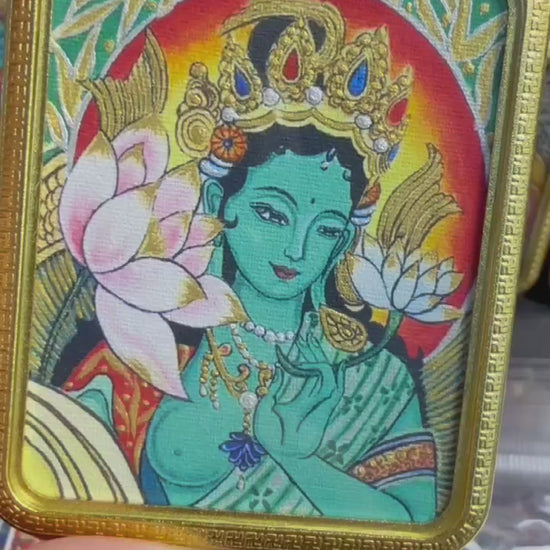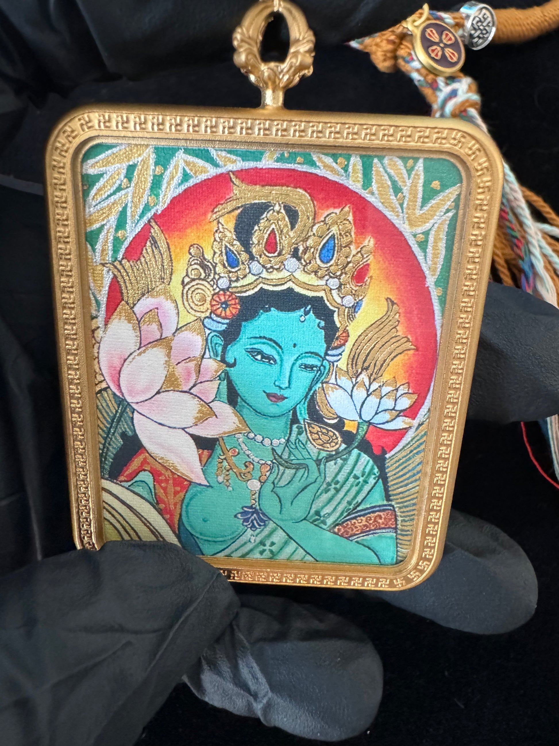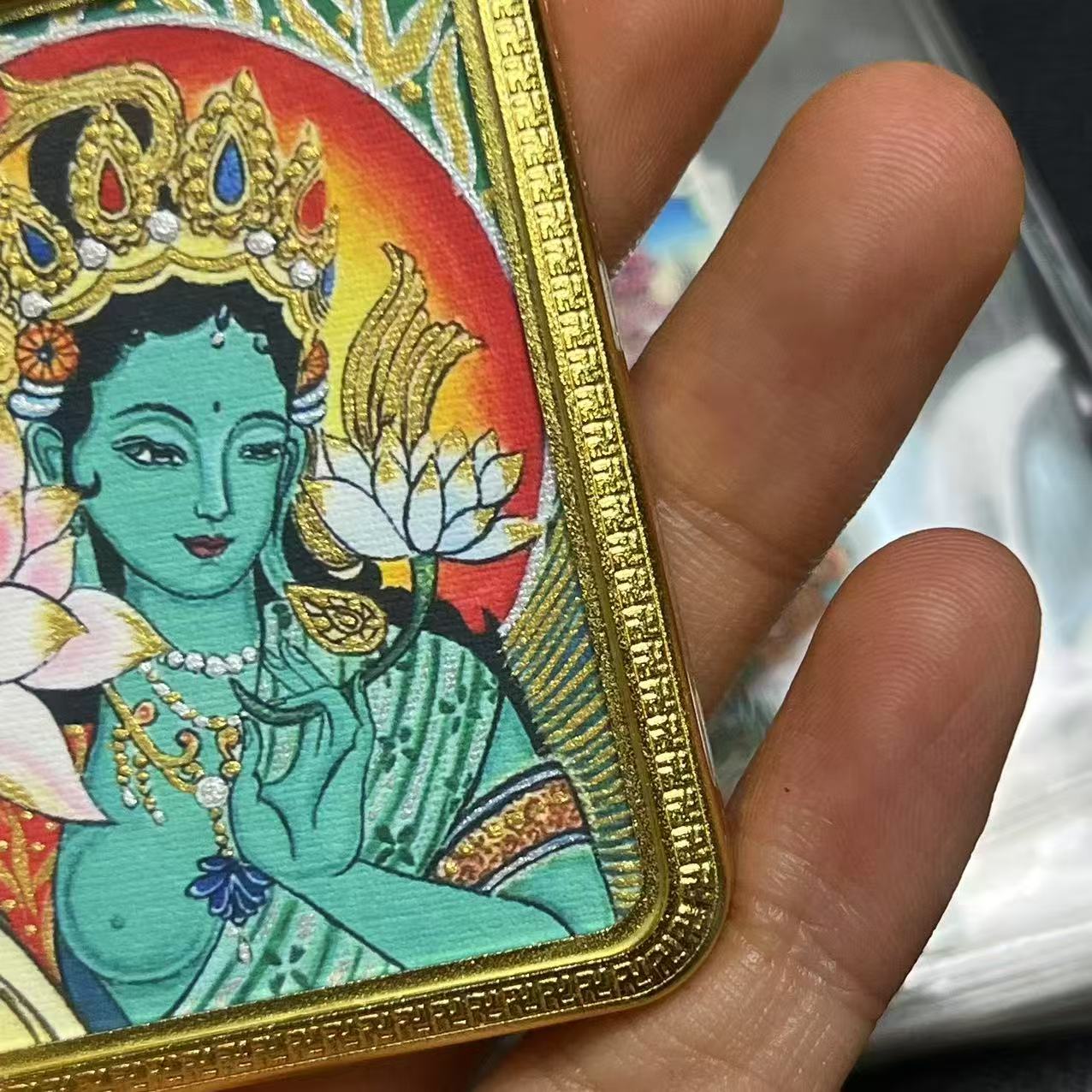 This 4×5 cm Tangka necklace is an ingenious hand-painted image of a very representative god in Tibetan Buddhism. The big black sky suppresses evil and evil, the black god of wealth and the yellow god of wealth attract wealth and blessings, the pharmacist Buddha protects the body and mind, the Nanhai Guanyin is compassionate and relieves suffering, and the green mother and the white mother bless peace and prosperity. With traditional Tangka technology, natural pigments are used to outline the solemn appearance of the law, and the profound Buddhist culture is condensed between the square inches. Wearing it is like being blessed by the gods, gathering wealth opportunities, filling spiritual energy, and making faith like a shadow. It is not only an artistic treasure that carries the thousand-year-old Tibetan Tangka culture, but also an auspicious thing that prays for beautiful wishes and protects the smooth life.